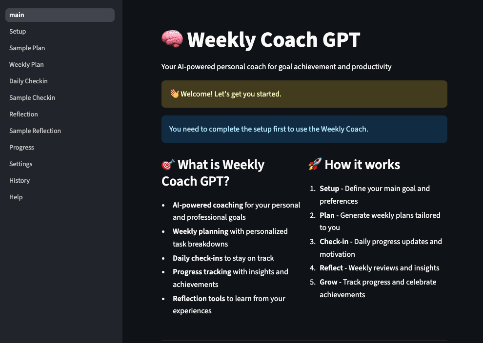 An AI-powered personal coach that helps you achieve your goals through personalized weekly planning, daily check-ins, and intelligent progress tracking.