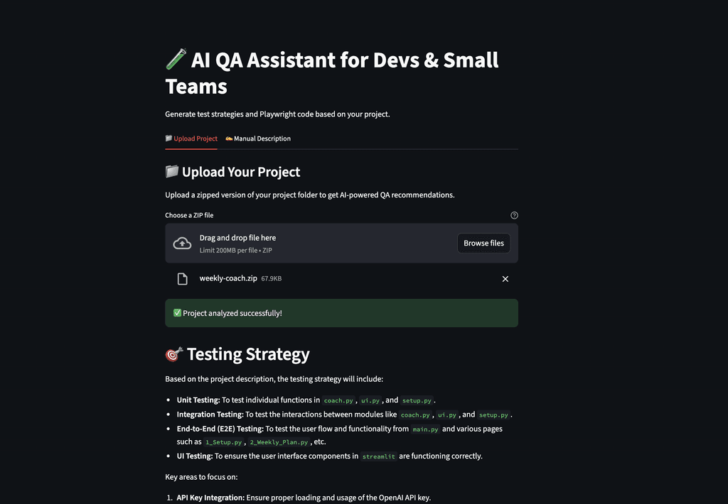 A web app that turns your project idea or zipped repo into a tested prototype: it thinks through test strategy, generates case scenarios, and even provides Playwright test code.